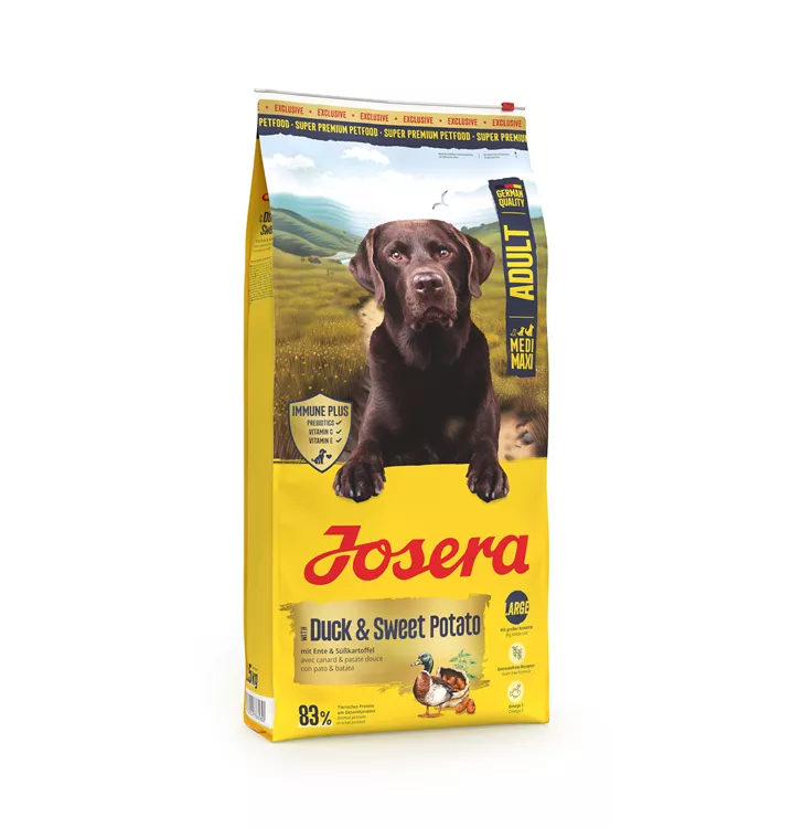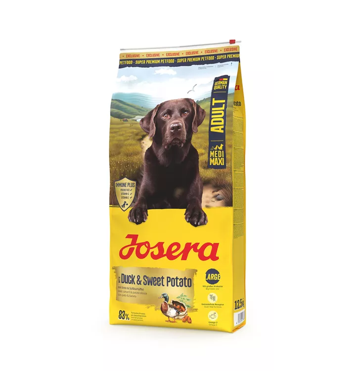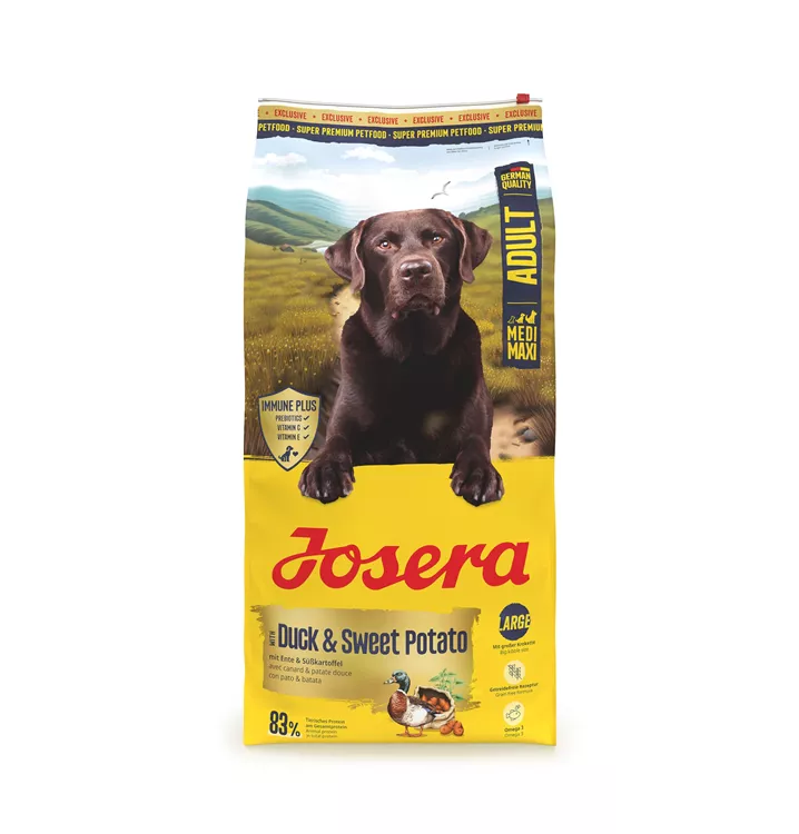 Große Pfoten, großer Appetit? Für diesen Fall haben wir unser Josera Medi/Maxi Duck & Sweet Potato!Das Hundefutter mit schmackhafter Ente und Süßkartoffel ist dank der extra großen Krokette perfekt für große Hunde oder Hunde, die zum Schlingen neigen. Die getreidefreie Rezeptur ist nicht nur lecker, sondern hat außerdem eine hohe Akzeptanz und wird gerne gefuttert. Der moderate Energiegehalt versorgt normal aktive, mittlere und große Vierbeiner Tag für Tag.