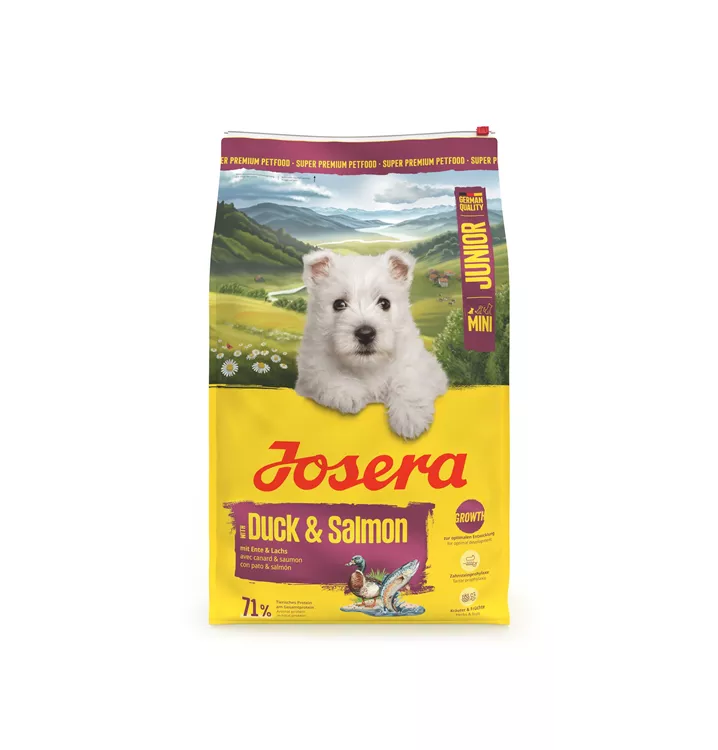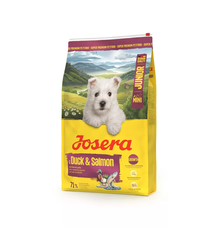 Klein aber oho! Josera Mini Junior Duck & Salmon ist unser spezielles Aufzuchtfutter für kleine Vierbeiner, das eine optimale Entwicklung unterstützt. Dank wertvoller Fettsäuren aus dem Lachs unterstützt das Welpenfutter die Gehirnentwicklung. L-Carnitin und hochwertige Proteine fördern eine optimale Entwicklung der Muskulatur. Taurin sowie L-Carnitin sind wichtige Nährstoffe für das Herz.